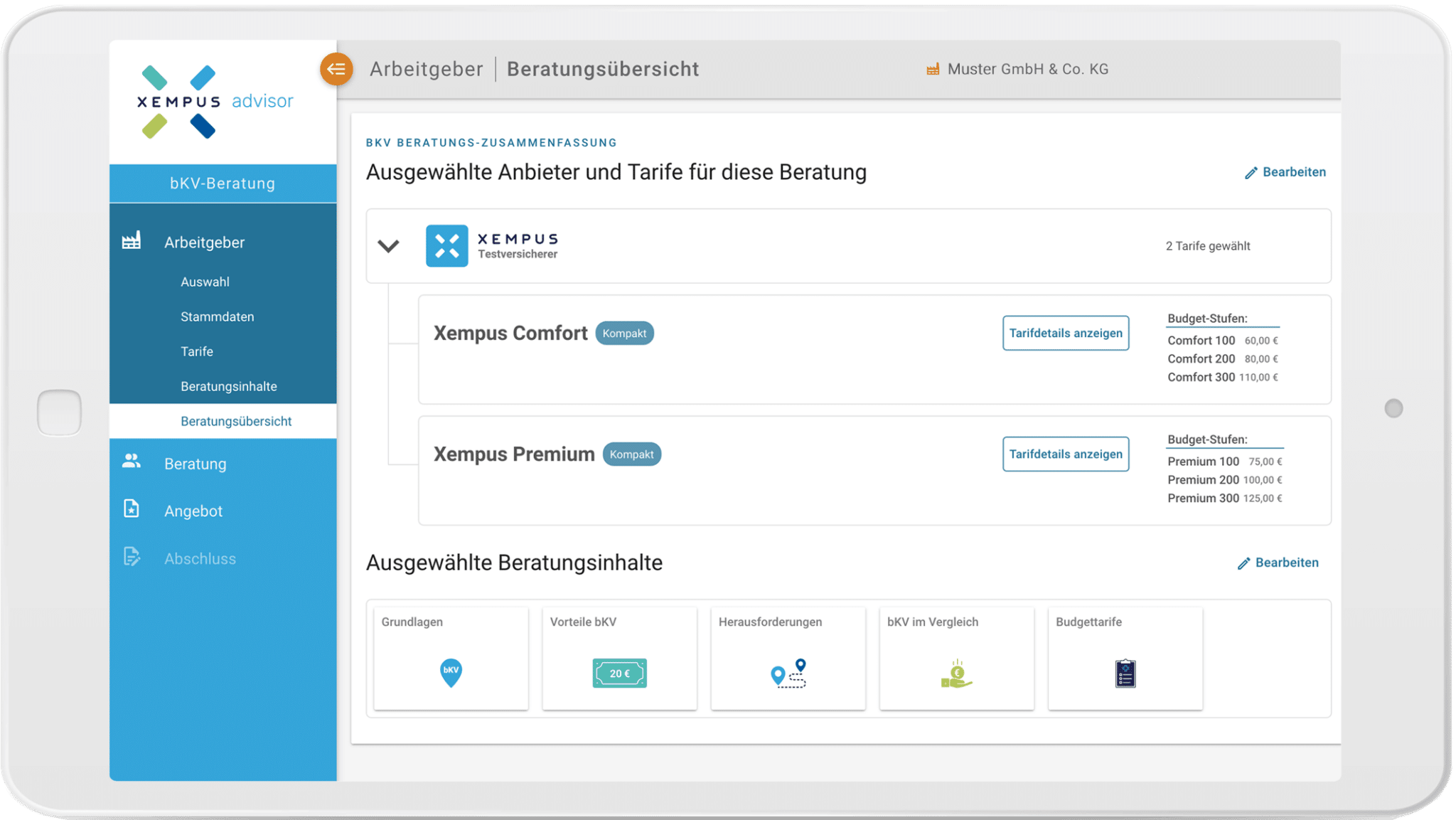 In der bestehenden digitalen Beratungsstrecke „Xempus advisor“ wurde die betriebliche Krankenversicherung nahtlos integriert. Vermittlerinnen und Vermittler loggen sich ein und entscheiden, ob sie die bAV- oder bKV-Beratung starten wollen.
